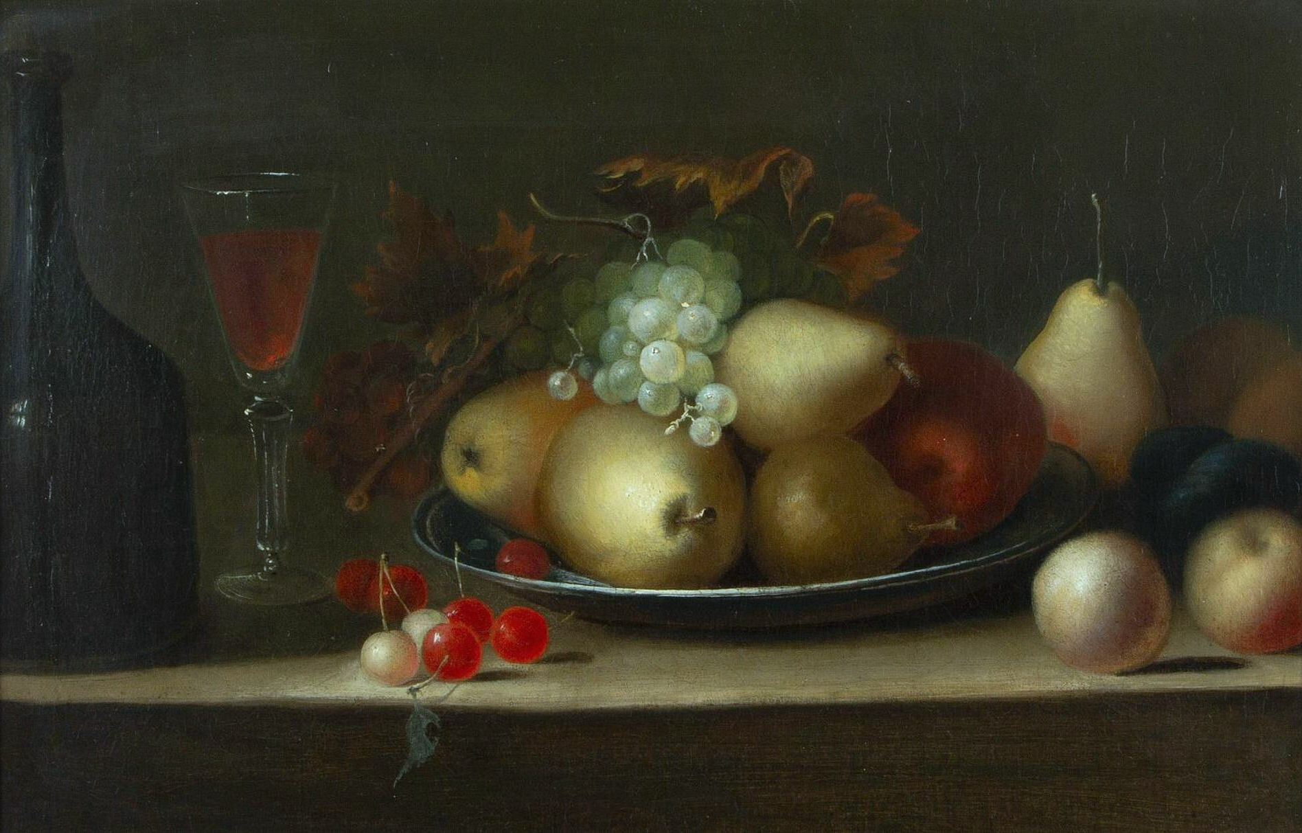 Piatto di ceramica con frutta, bottiglia e calice di vino